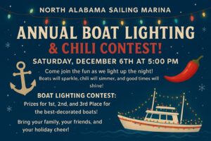 It’s that time of year again! Browns Creek Sailing Association & North Alabama Sailing Marina are teaming up for the Annual Boat Lighting & Chili Contest. Mark your calendars for Saturday, December 6th at 5:00 PM — and we want YOU to be part of the fun!